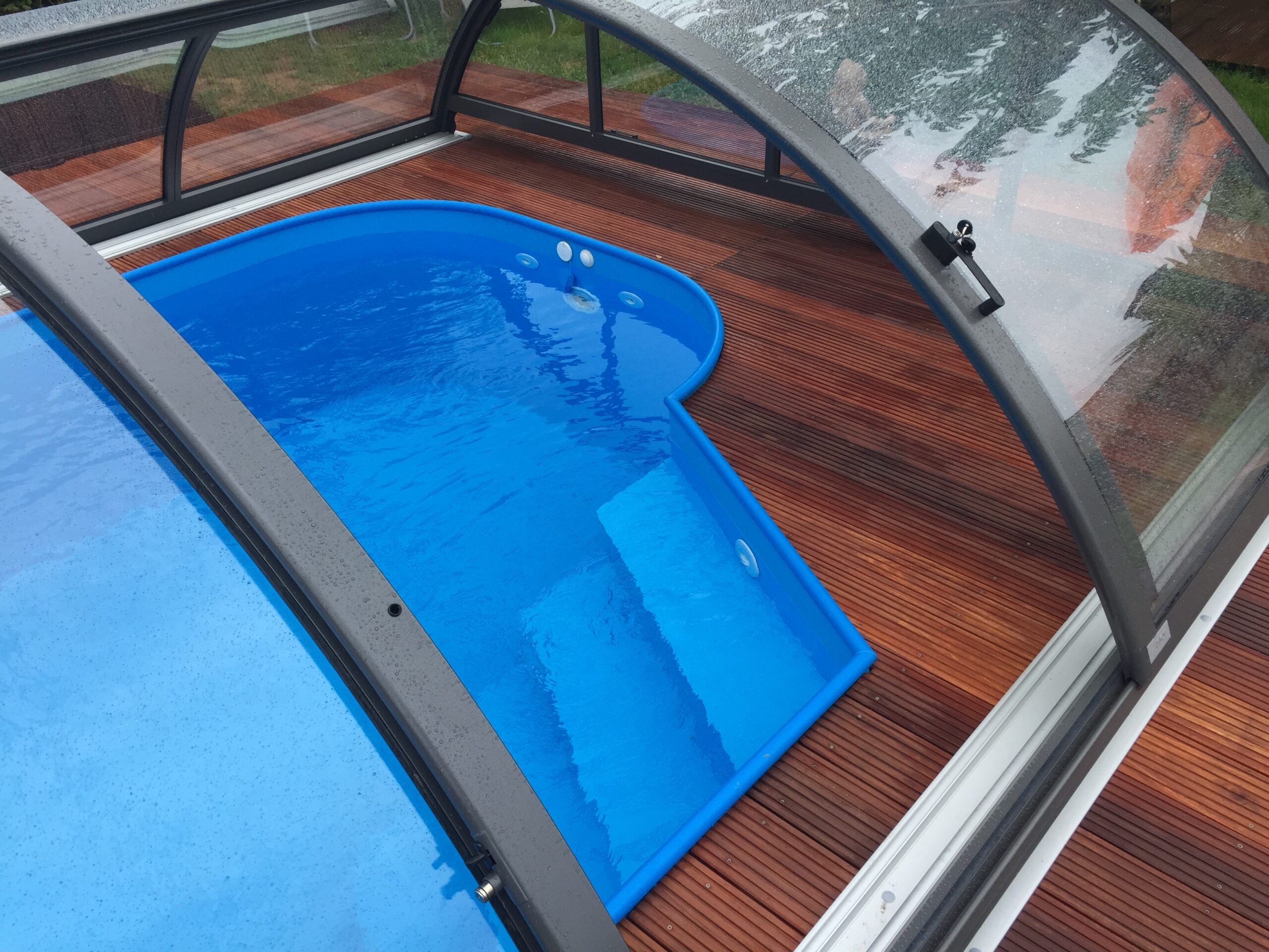 Bei Becken mit mehr als 3m Breite werden diese (andere auf Wunsch) in Teilen geliefert und gegen Aufpreis vor Ort zusammengeschweißt. Polyesterbecken werden grundsätzlich als Komplettbecken an einem Stück geliefert.