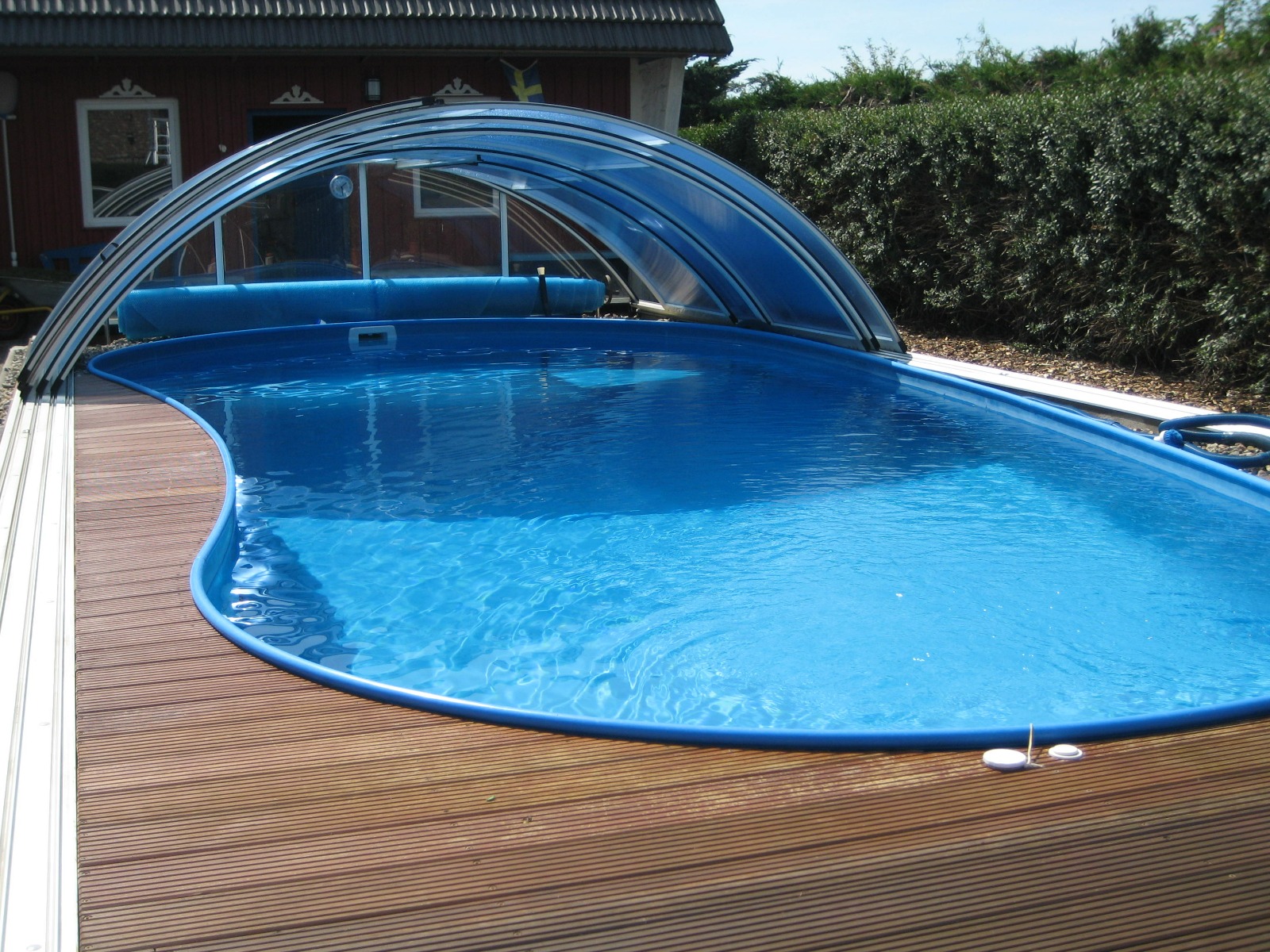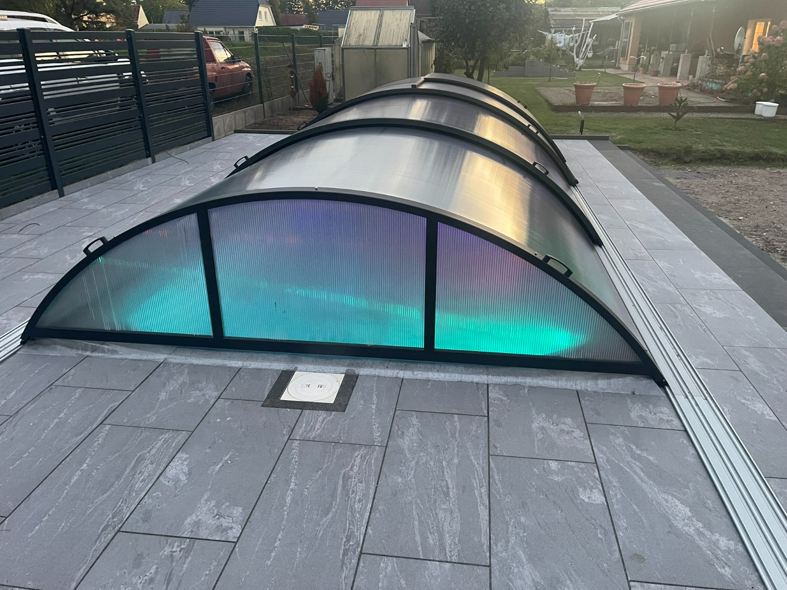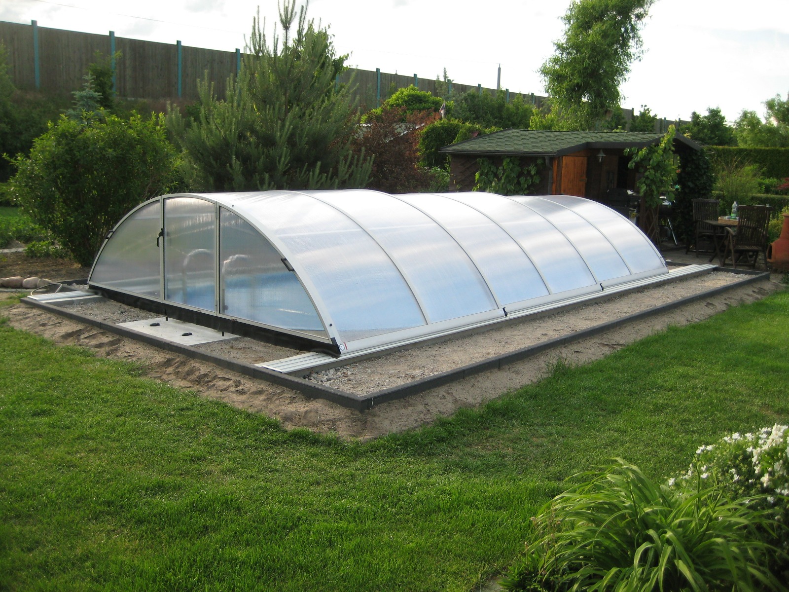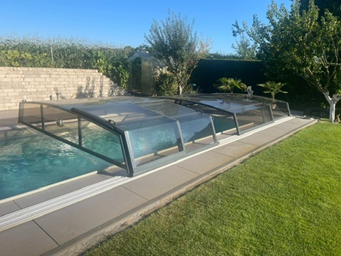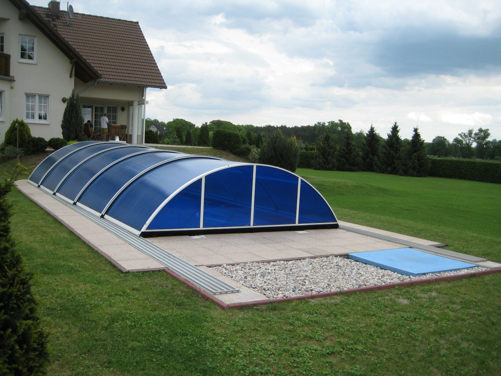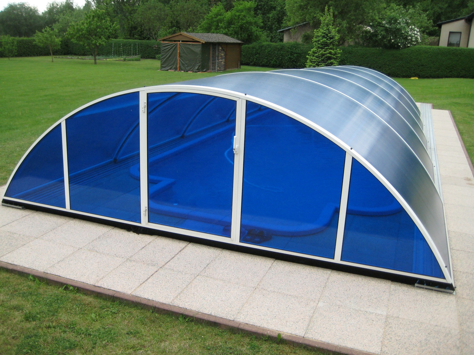 Alle Überdachungen stammen aus der EU-Produktion, sind aus Aluminium (Profile) und hochwertigen Polycarbonatplatten mit bis zu 10 Jahren Herstellergarantie. Die Formen sind von flach über mittelhoch bis voll begehbare Überdachungen. Alle Überdachungen sind auf Schienen beweglich, und können auf Wunsch mit Schienenverlängerungen ausgerüstet werden.